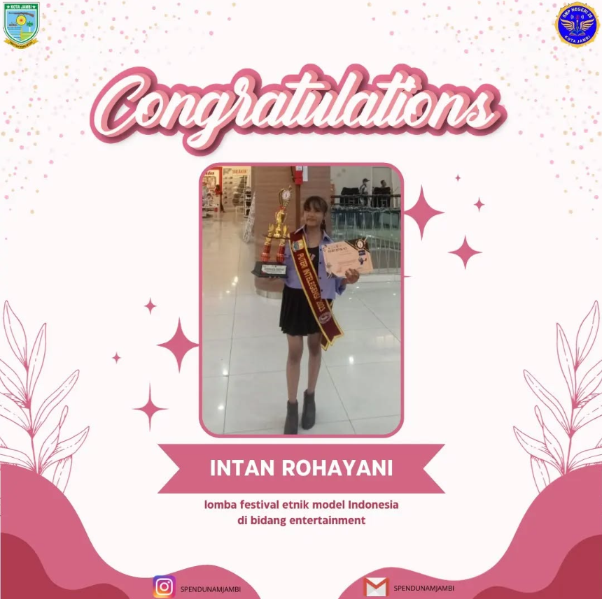 Kami mengucapkan selamat atas prestasi yang diraih oleh Sheza Irlincya dalam ajang Putra Putri Jambi. Keberhasilan ini merupakan hasil dari kerja keras dan dedikasi yang tinggi sebagai wakil SMP Negeri 26 Kota Jambi.